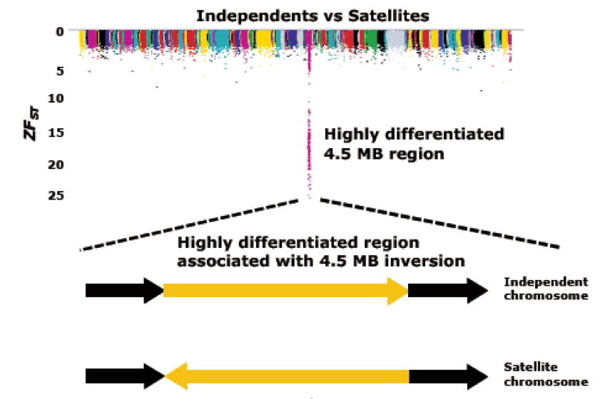 We sequenced genomes of 15 Independents, nine Satellites and one Faeder male to explore the genetic basis of such complex phenotypic differences. We identified a large 4.5 MB inversion in Satellites and Faeder that occurred 3.8 million years ago. Further examination of this locus revealed it being recessively lethal as it disrupted CENPN, a critical gene responsible for cell division. There were additional deletions within the inversion around HSD17B2 gene that converts testosterone into less-active keto-forms. These deletions in Satellite and Faeders possibly lead to overexpression of HSD17B2 that causes increased degradation of testosterone leading to submissive behavior in these males. We also identified four missense mutations at highly conserved sites in MC1R gene within the inversion, which is possibly associated with white ornamental feathers in Satellites.