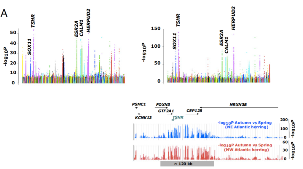 Genetic differences associated with spawning time are expected to involve photoperiodic regulation of reproduction. Interestingly, our strongest genetic signal between populations that spawn either in spring or autumn overlapped TSHR that has central role in the photoperiodic regulation in birds and human. Genetic variants associated with adaptation to spring or autumn spawning are shared to a large extent among populations across the Atlantic Ocean and the Baltic Sea, providing evidence for parallel adaptive evolution.