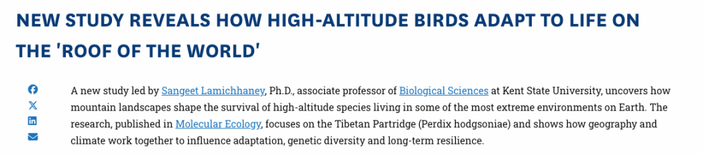 Our lab published a paper in Journal of Molecular Biology and Evolution where we we studied genomic variation, gene expression, and long-term adaptation in Tibetan Partridge (Perdix hodgsoniae) populations residing across the elevational gradient of the Tibetan Plateau.